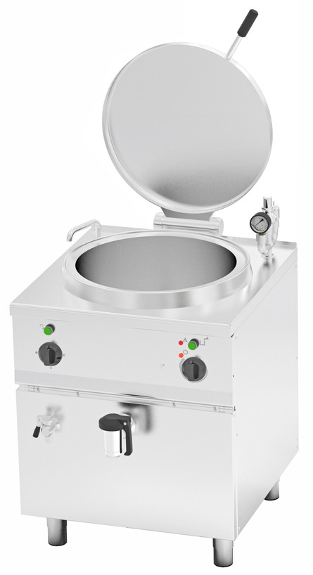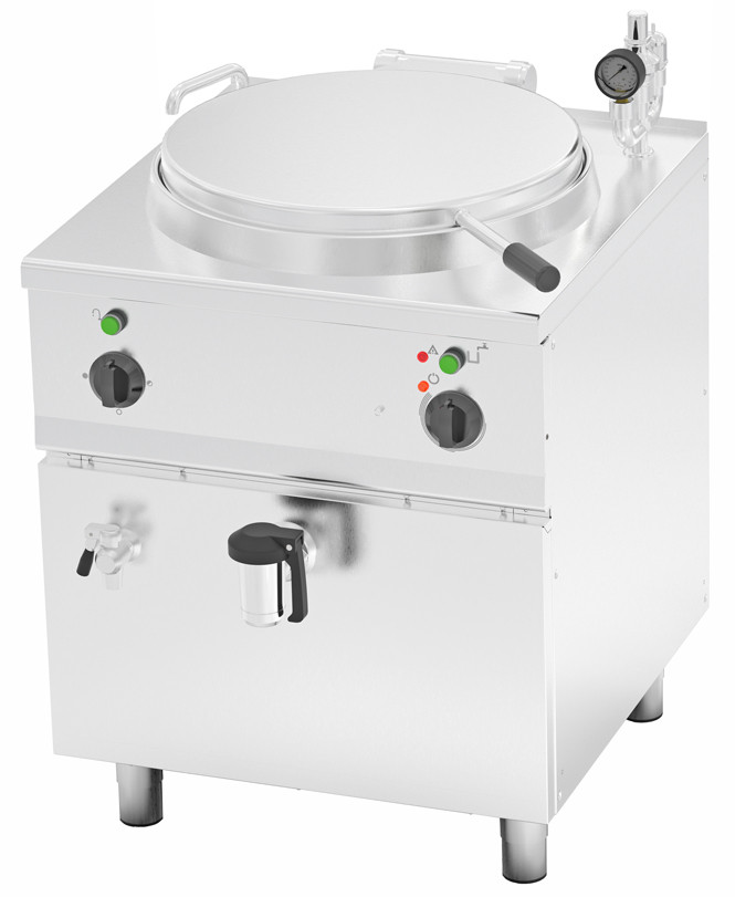Работа котла основана на пароводяном принципе нагрева чаши - вода подается в так называемую "рубашку" вокруг чаши и нагревается нагревательным элементом, тепло от воды передается на продукт в чаше котла плавно и равномерно по всему объему чаши, исключая пригорание пищи.
